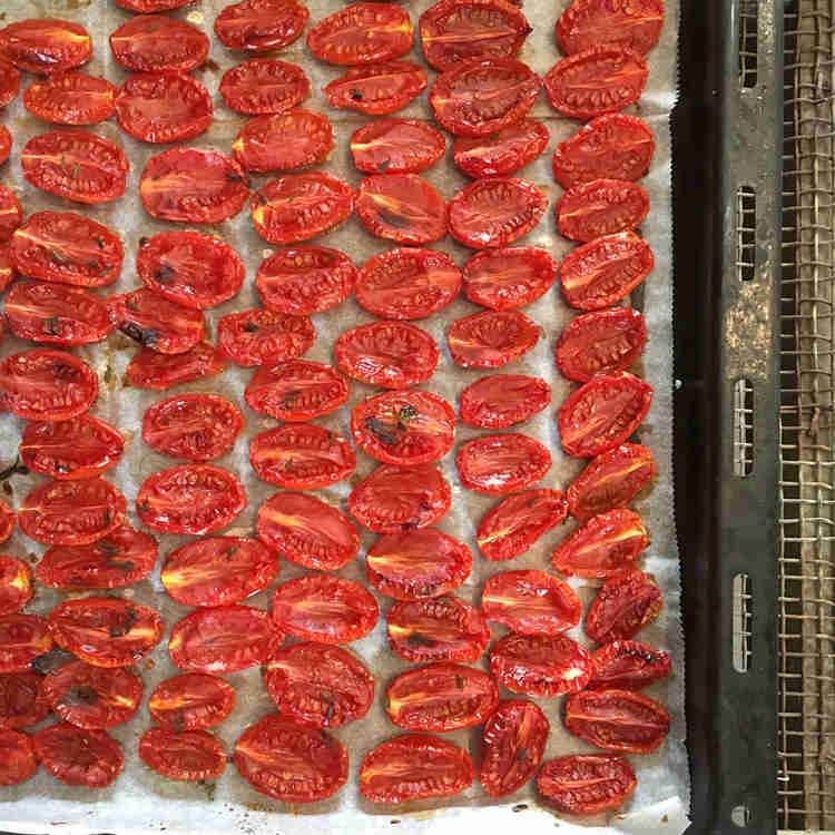 7. הכניסו את התבנית ותשארו בקשר עין. לרוב העגבניות יהיו מוכנות כעבור שעתיים. תסתכלו מידי פעם ותטעמו. רצוי להגיע לשילוב של יבוש העגבניה וניגעות עדינות של צריבת חרוכה.(ראו תמונה)